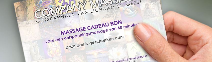 De massage cadeaubon is een heerlijk cadeau om te geven en te ontvangen.Perfect voor een verjaardag, een bijzondere gelegenheid, een bedankje of een beloning.Company Massage heeft cadeaubonnen voor diverse massages of andere behandelingen en voor iedere portemonnee.